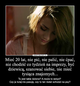 W dodatku zawsze znajdzie się kolejny głąb, który musi pocieszyć autorkę (albo autora, bo wśród takich batonów panuje niezwykłe równouprawnienie), że wcale nie jest dziwna, a świat upadł. Prawdopodobnie wyobraża sobie płomienny romans z wzorową żoną o aparycji modelki. Jest to o tyle zabawne, że wszystkie znane mi wzorowe żony przypominają dorodnego humbaka i - jak stawiam - do poderwania ich potrzebny jest solidny harpun. Jeśli czyta to któraś z Was, bądźcie tak dobre i nie płaczcie - nie potrzebuję na blogu zapasu tranu. Jak można upaść tak nisko, by szukać akceptacji w internecie? I to jeszcze metodą retorycznych pytań i podkreślania swojej wartościowości? To jakaś zmutowana wersja obśmianego tysiące razy napiszę, że brzydko wyszłam. Nie pijesz? Setki ludzi nie piją bez potrzeby chwalenia się. Bo i nie ma czym tak po prawdzie, to tylko życiowy wybór. Nie ćpasz? A ilu znasz ćpunów? Prawdziwych, regularnych ćpunów walących po zatokach, kablach i łykających wszystko, co znajdą? Nie chodzisz co tydzień na imprezy? Ja też nie, bo mi się nie chce. Nie wiem jednak, w jaki sposób czyni Cię to lepszą od osoby, która akurat ma fantazję się zabawić. Nie wiem zresztą, co miałabyś robić na imprezach. Knajpa, klub czy domówka mimo wszystko różnią się od oceanarium. Być dziewicą. Mój ulubiony argument. Dziewictwo. 20 lat i brak pociągu seksualnego świadczy o schorzeniu. Podobnie jak sztuczne tłumienie go w oczekiwaniu na tego jedynego, który prawdopodobnie uzna, że coś z Tobą nie tak, skoro w wieku 25 lat dalej jesteś dziewicą. O ile nie zemdleje na widok krwi. Niezbyt zaskakujące jest to, że szanują siebie głównie kobiety, które i tak mogłyby zagrać tytułową rolę w Uwolnić orkę bez charakteryzacji. Te wyglądające jak ludzie nie dymają wszystkich znanych sobie osób, ale też nie mają trudności z budowaniem życia uczuciowego czy seksualnego.